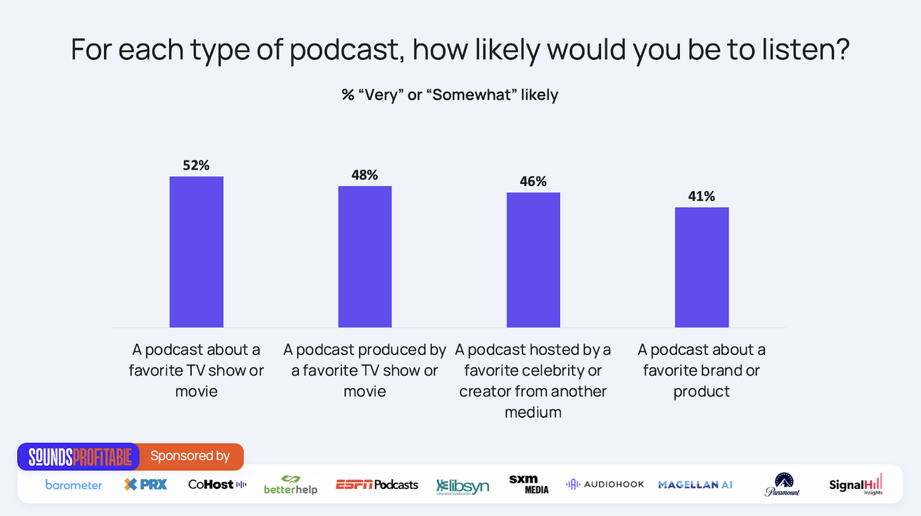 A fascinating data point from Tom Webster's recent report "The Podcast Landscape in America" shows that 43% of Americans 18+ say they'd be interested in listening to a podcast about their favorite brand or product.
